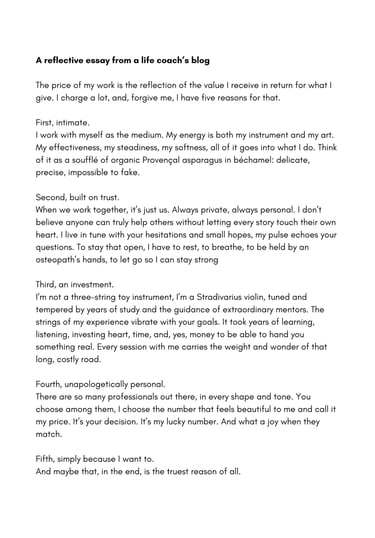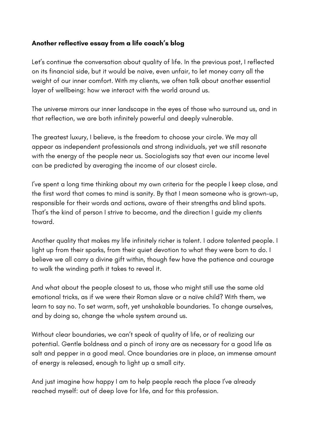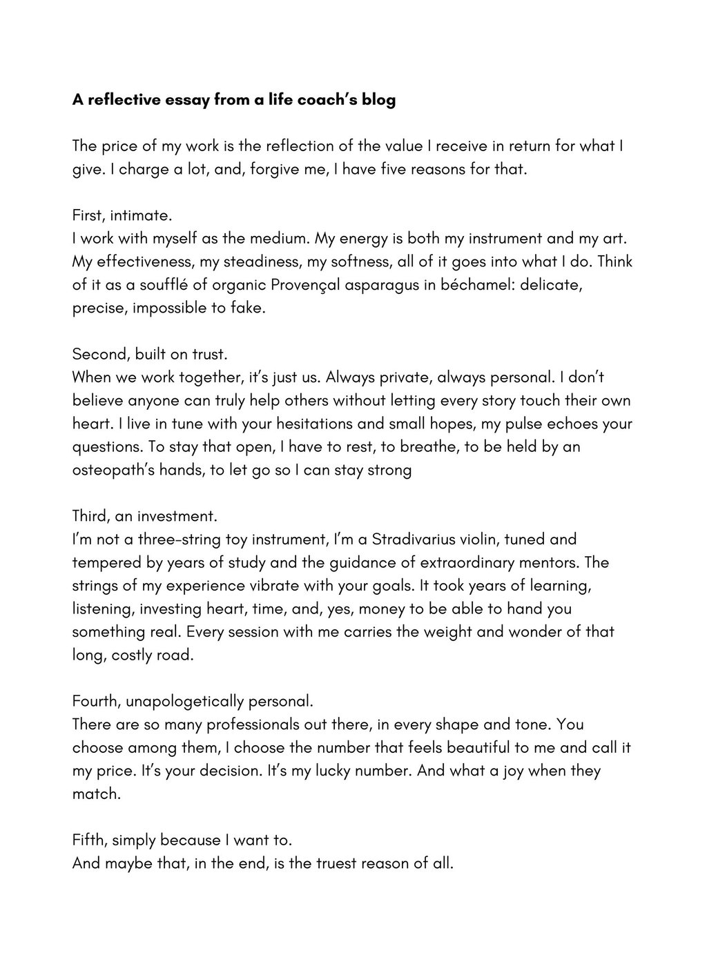Result: A series of essays that read as both poetic and professional. This one shows how a single thought can evolve into a living piece of writing: warm, elegant, and deeply human, aligning the client’s voice with her purpose.