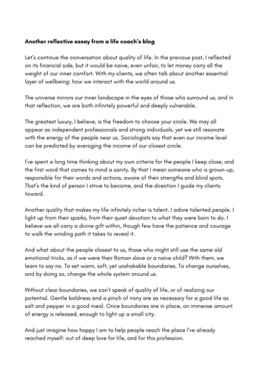 Challenge: The client, a psychologist and life coach, wanted to build a personal blog that felt intimate, intelligent, and emotionally real. Each post began with a single line, which I developed into a reflective essay capturing her tone and philosophy.
