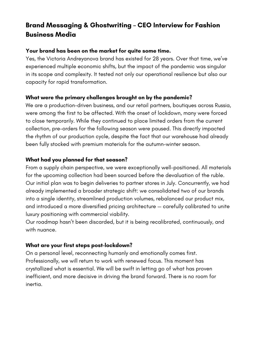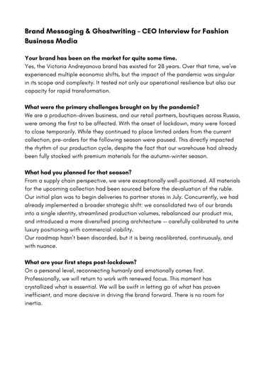 Challenge: The founder of a heritage fashion brand was invited to speak with a respected business publication about the future of the company, its response to the pandemic, and the evolution of its strategy. The source material consisted of informal voice notes and scattered bullet points. My task was to shape them into a cohesive, elegant narrative, one that reflected the founder’s personality: calm, intelligent, and quietly visionary.