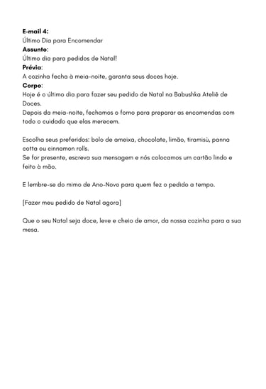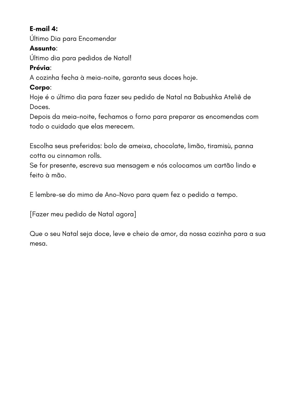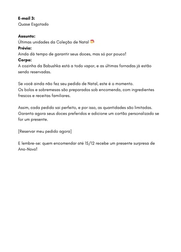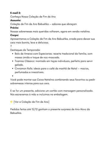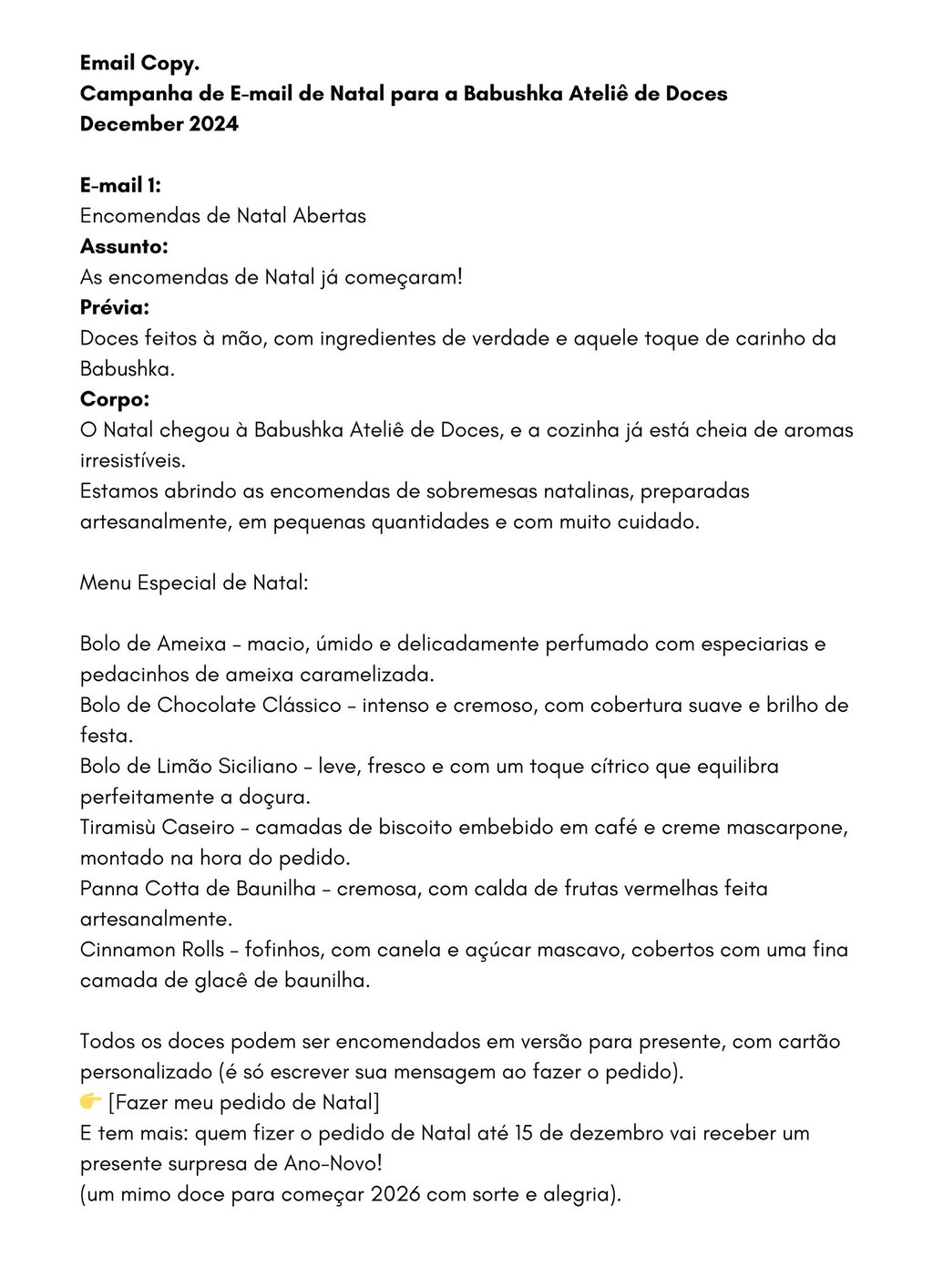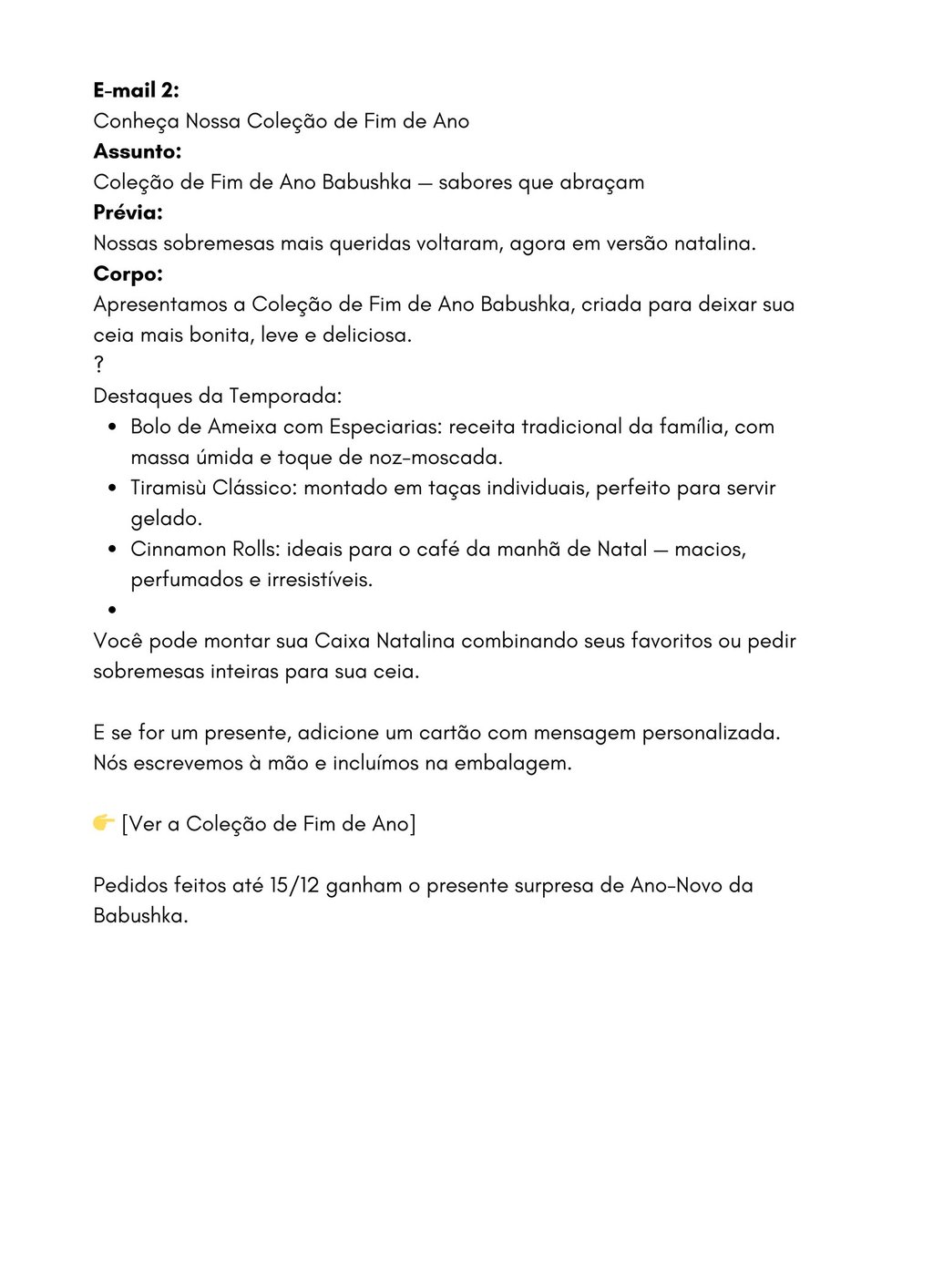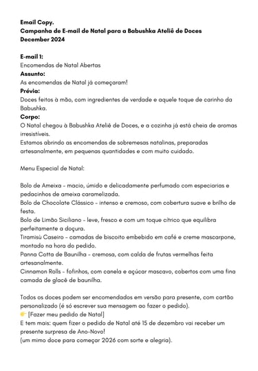 Challenge: Criar uma sequência de e-mails natalinos que aumentasse as encomendas e transmitisse o tom acolhedor e artesanal da Babushka, sem exageros poéticos.