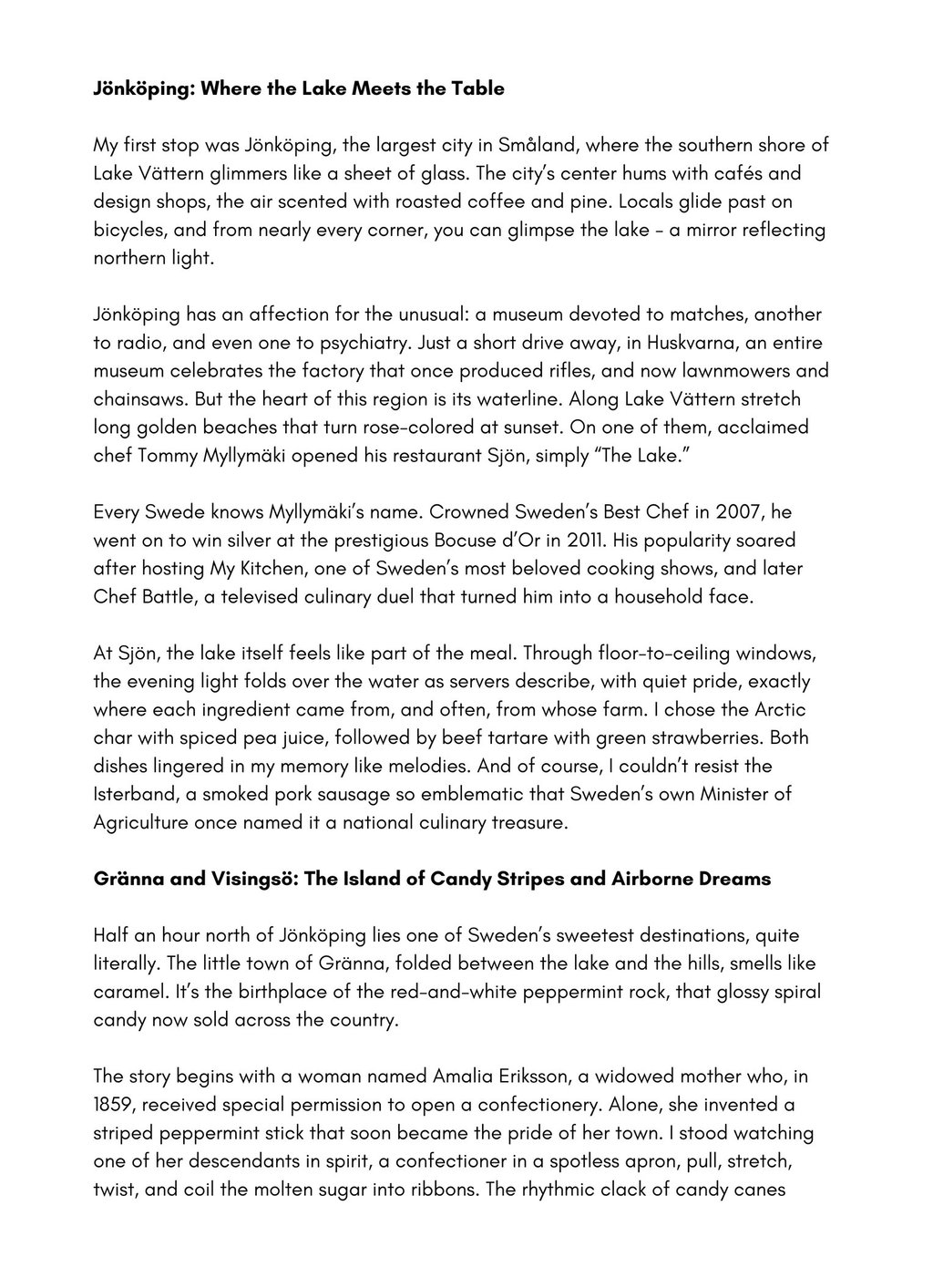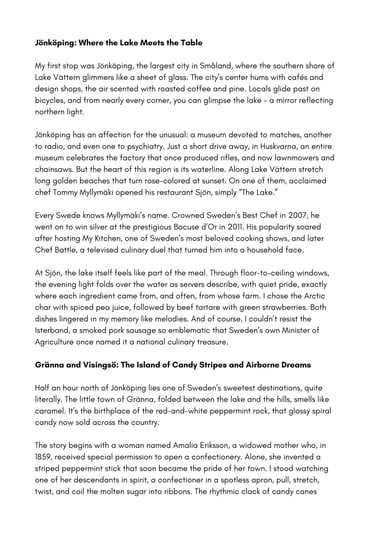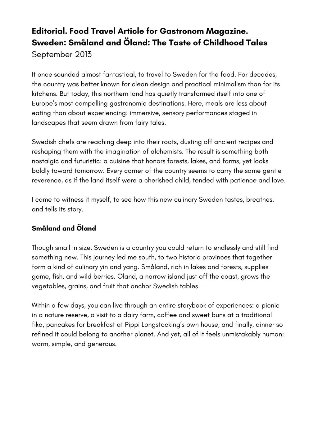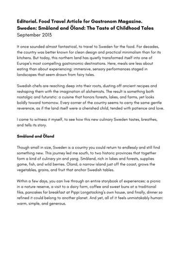 Result: Published in the print issue of Gastronom Magazine, “Sweden: Småland and Öland — The Taste of Childhood Tales”became a lyrical exploration of the country’s emerging food identity, blending reportage and sensory prose to reveal Sweden as a rising culinary nation.