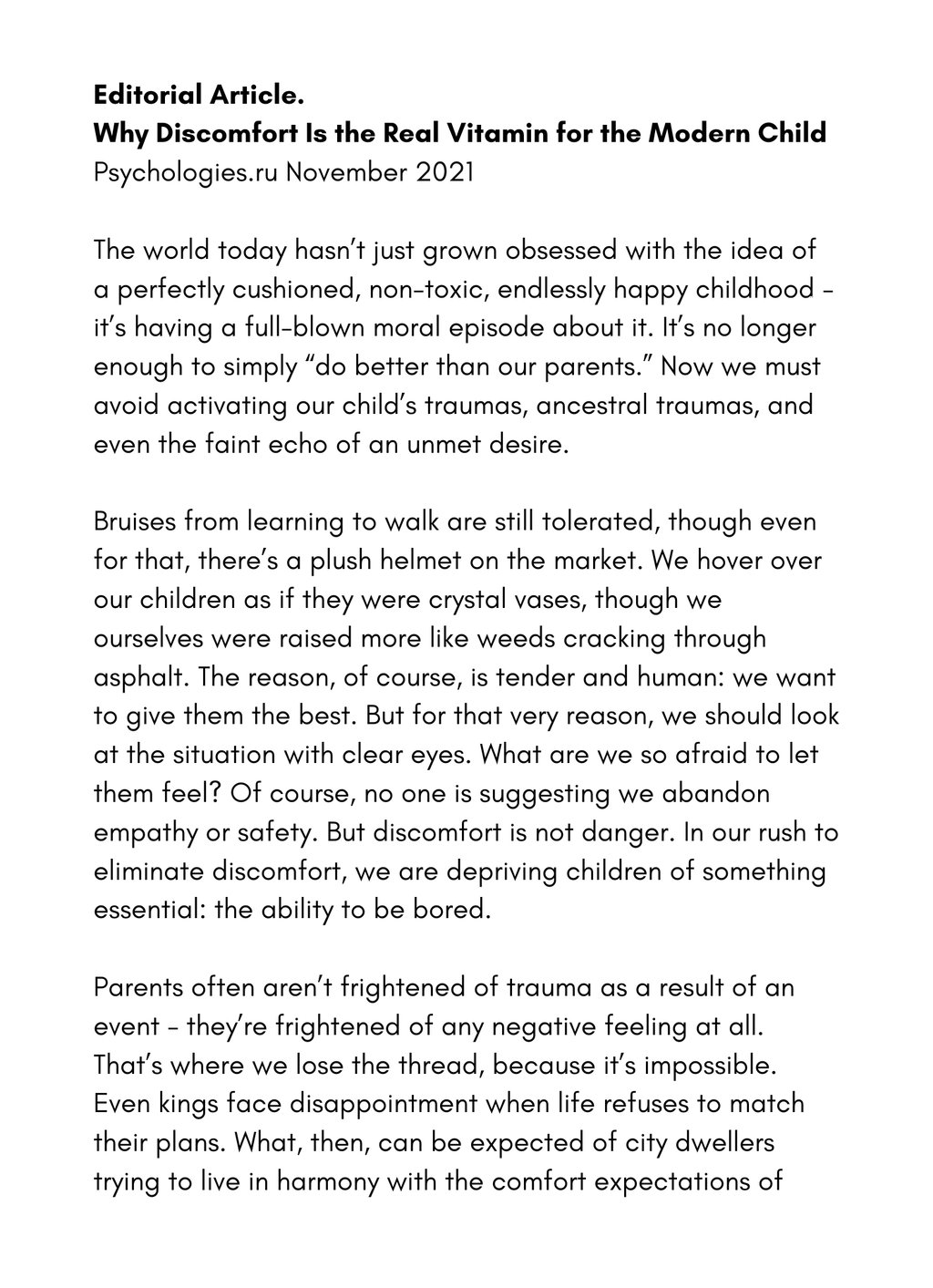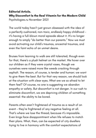 Challenge: To write a reflective editorial for Psychologies.ru that challenged the modern obsession with comfort in parenting and redefined discomfort as an essential element of emotional growth.
