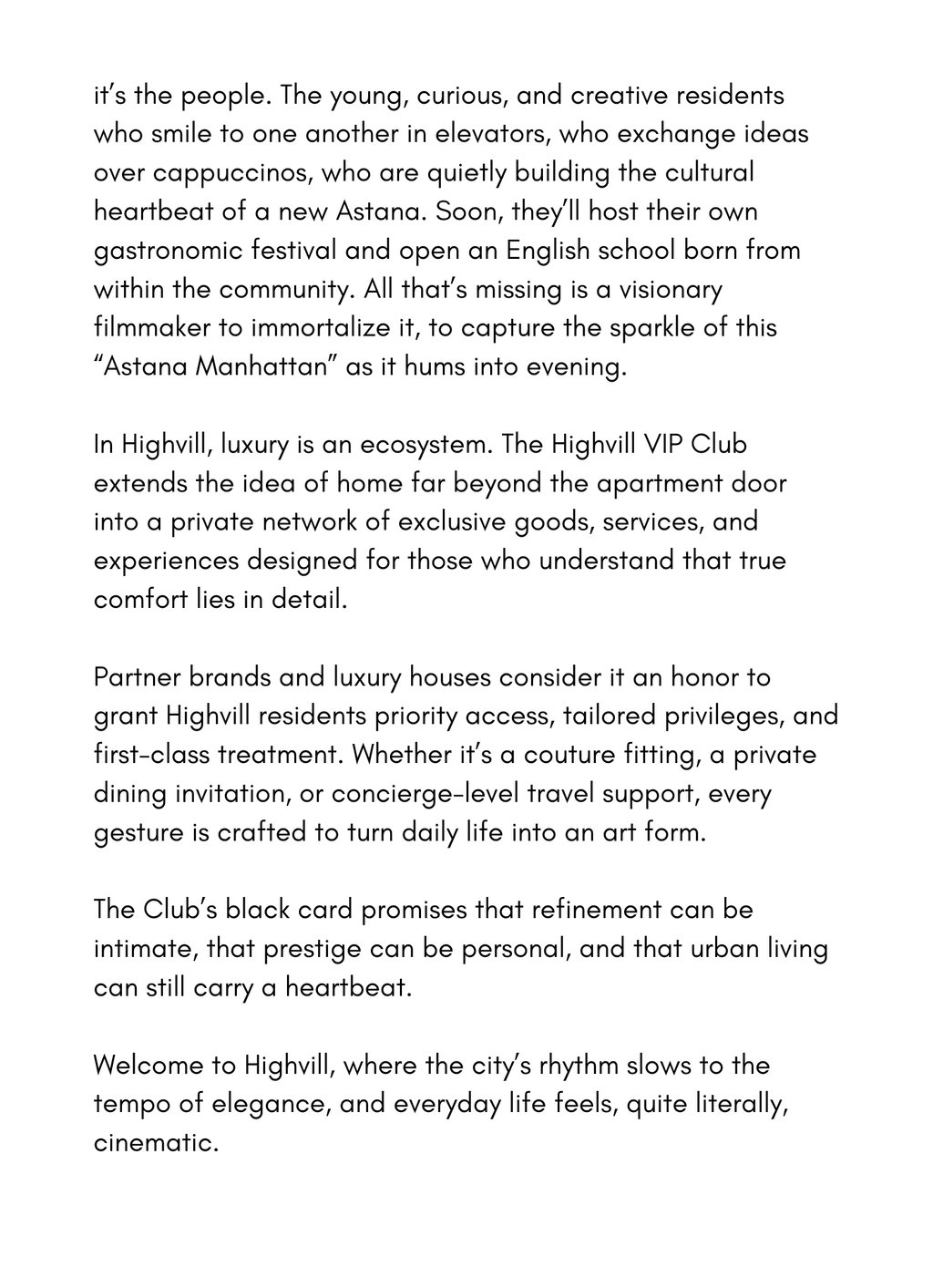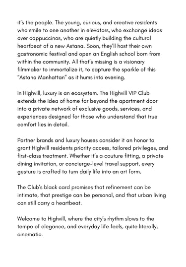 Result: The resulting copy presented Highvill as the “Manhattan of Astana” — a place where design meets emotion, lifestyle meets story — turning a property brochure into a brand experience that elevates the perception of urban luxury living.